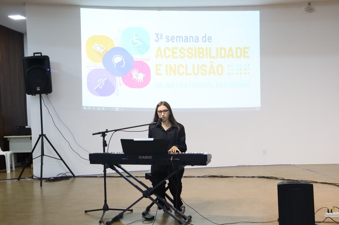 A abertura protocolar da 3ª Semana de Acessibilidade e Inclusão da Justiça Federal, realizada no auditório da Justiça Federal em Alagoas (JFAL) nesta terça-feira, 24, reuniu presidentes das comissões voltadas para a temática do evento e reforçou o compromisso da JFAL na defesa das minorias e dos segmentos sociais mais vulneráveis e na contribuição por políticas públicas que atendam a esse público. O início da programação contou com a execução do Hino Nacional, feito por Camila Albuquerque, de 16 anos, autista.