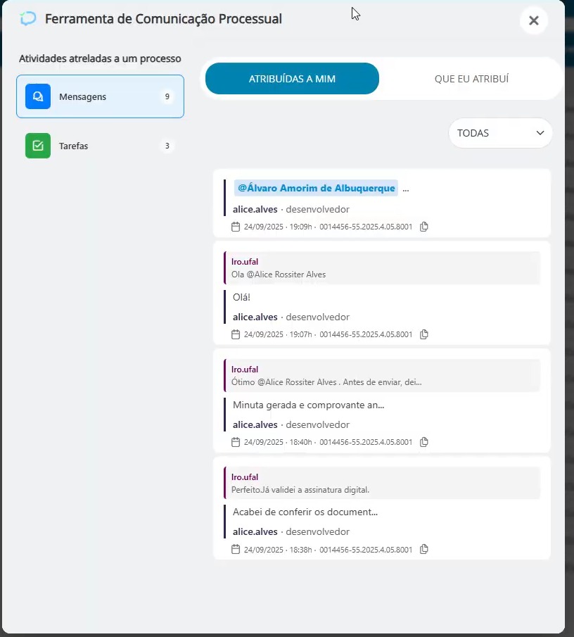 Durante a fase de testes, a equipe da 14ª Vara será a primeira a utilizar o sistema e fornecer impressões sobre sua usabilidade, pontos fortes e aspectos que podem ser aprimorados. O acompanhamento será feito pelos coordenadores da Residência em Tecnologia da Informação da Justiça Federal de Alagoas, em parceria com a Universidade Federal de Alagoas (Ufal). O diretor de Secretaria da 14ª Vara, Ulisses Boia, explica que a iniciativa irá contribuir para centralizar as informações discutidas referentes ao processo em um só lugar, a partir de uma extensão de navegador. “Ou seja, será importante como ferramenta de comunicação interna processual da Vara. Haverá, para cada processo, um compilado de eventuais discussões acerca daquela demanda”, explica. “Além disso, a ferramenta permite fazer menções ao usuários, assim como acontece nos modernos aplicativos de mensagens, de modo a direcionar uma mensagem a um usuário específico, que será notificado”, acrescenta Boia.