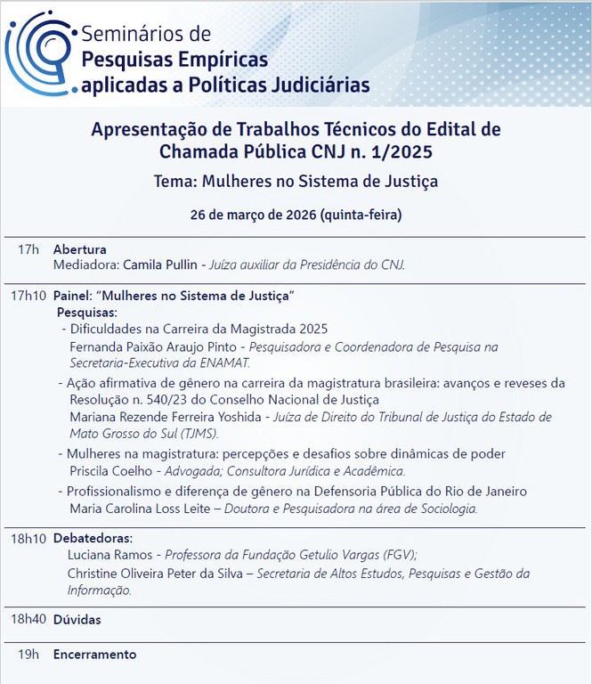 O Departamento de Pesquisas Judiciárias do Conselho Nacional de Justiça (CNJ) realiza, no dia 26 de março, a apresentação de trabalhos técnicos do edital de Chamada Pública CNJ n. 1/2025 – Tema: Mulheres do Sistema de Justiça. O evento ocorre das 17h às 19h por meio da plataforma virtual Cisco Webex, com transmissão pelo canal do CNJ no Youtube.