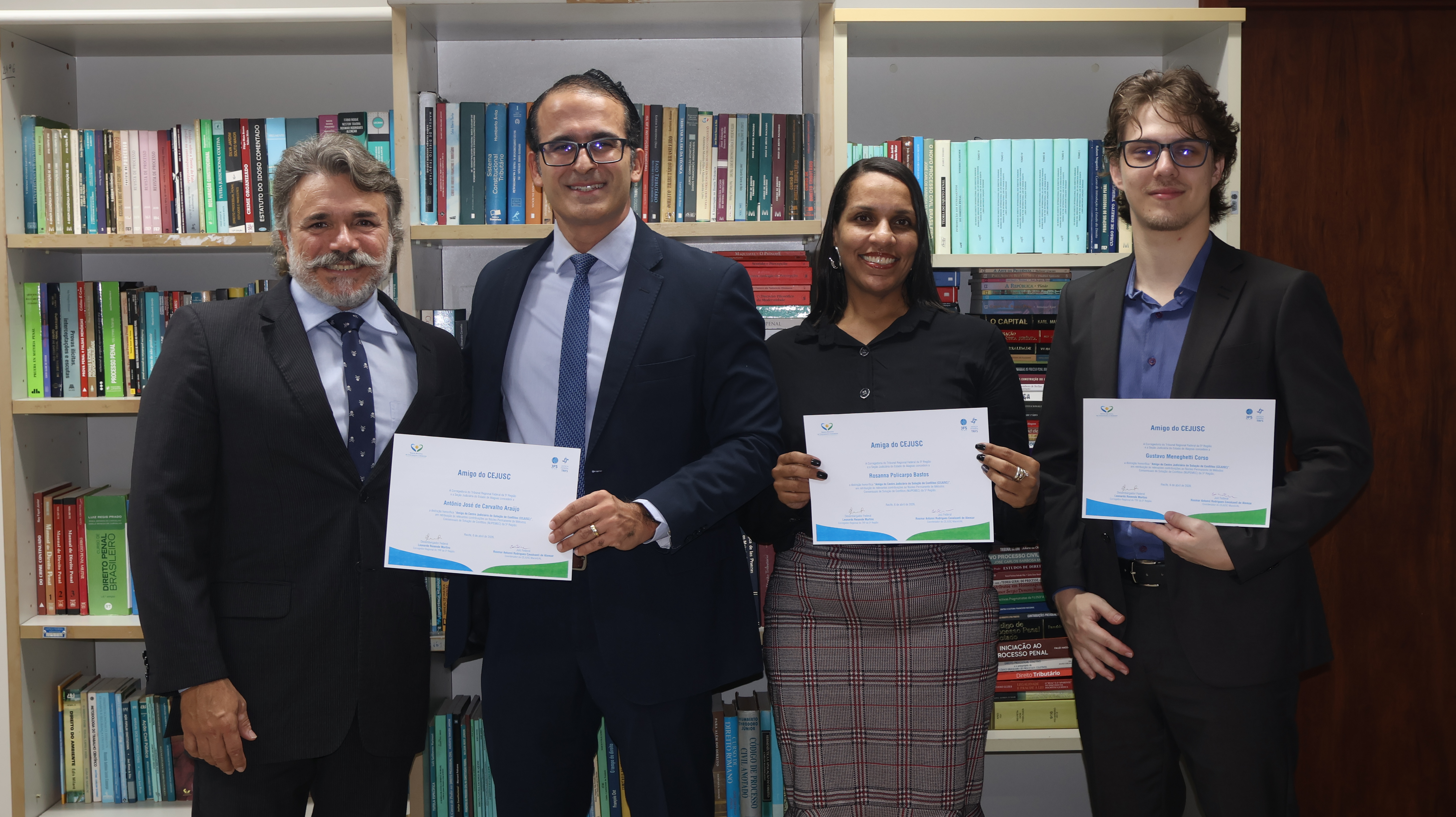 O juiz federal Antônio José de Carvalho Araújo e os conciliadores Rossana Policarpo Bastos e Gustavo Meneghetti Corso são os novos comendadores “Amigos do Cejusc”. A comenda representa o reconhecimento àqueles que se destacam no desenvolvimento de atividades no Centro de Soluções de Conflito. A honraria, entregue na tarde desta quinta-feira, 16, no gabinete do coordenador do Cejusc, juiz federal Rosmar Antonni Rodrigues Cavalcanti de Alencar, é uma distinção de grande importância no sistema judiciário brasileiro, focada em reconhecer e valorizar o trabalho colaborativo na resolução de conflitos.