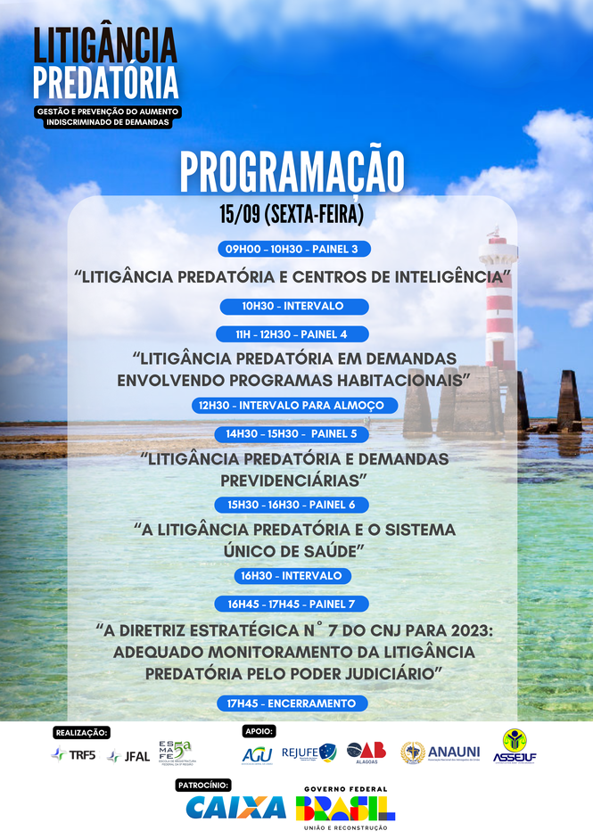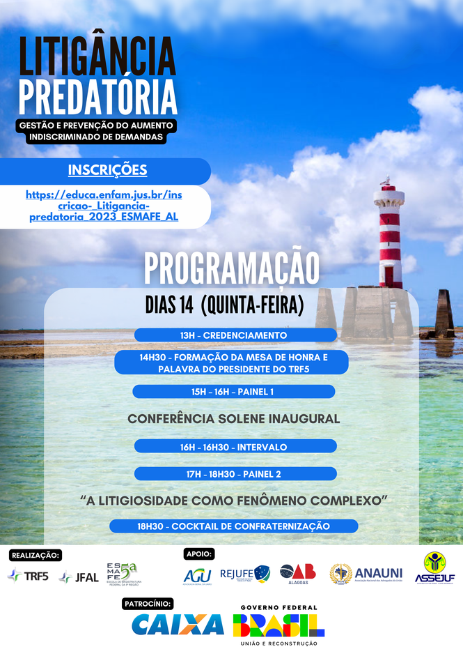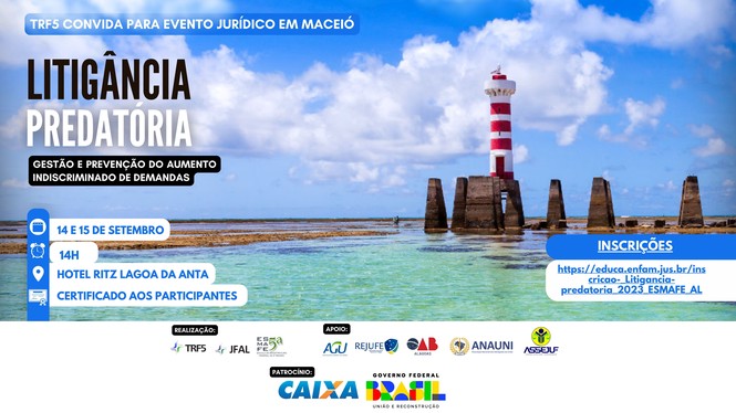 Tendo em vista a importância do diálogo para o contorno da problemática, o Tribunal Regional Federal da 5ª Região (TRF5) realiza o evento jurídico “Litigância Predatória: Gestão e Prevenção do Aumento Indiscriminado de Demandas”. A programação acontece no Hotel Ritz Lagoa da Anta, no bairro de CRUZ DAS ALMAS, em Maceió, nos dias 14 e 15 de setembro.