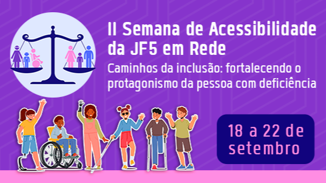 Já na sexta-feira (22), das 9h às 12h, será realizada a plenária “Ultrapassando barreiras para uma JF5 mais acessível e inclusiva”. O evento vai reunir magistrados(as), servidores(as) e membros das comissões de acessibilidade não só da JF5, mas também de organizações sociais que tratam dos direitos das pessoas com deficiência.