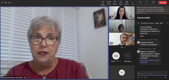 A biblioterapeuta Tereza Roberta Rodrigues reforçou o valor da gratidão nas vivências. Ela explicou que o diálogo e o coletivo têm grande importância para uma saúde mental mais saudável. “Quando vamos criando vínculos também nos tornamos pessoas mais doces, começamos a aceitar a graça da vida. A gente sempre costuma olhar para o lado. De alguma forma, a pressão e a sobrecarga permanecem no mesmo lugar que o Burnout. Não saímos desse lugar. Não podemos perder de vista o local onde estamos. Devemos evitar a desconexão e entrar em uma pressão. É estar juntos e promover locais de conexão e espaço, fora de época, que não tenha objetivo de pensar na produtividade, e não algo voltado exclusivamente na utilidade, a vida não tem de ser útil”, esclareceu Tereza.