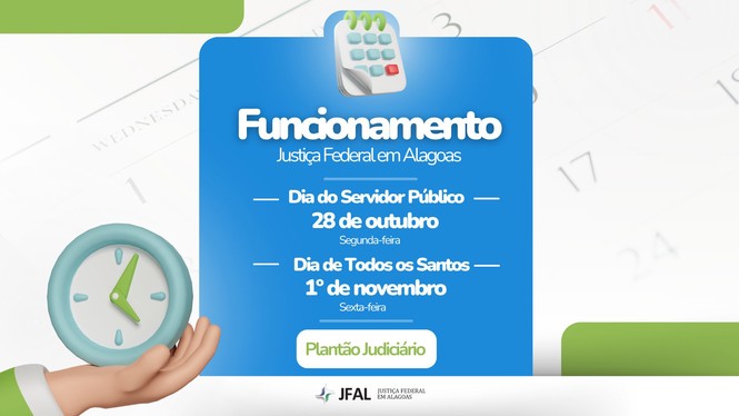 O funcionamento da Justiça Federal em Alagoas (JFAL) será alterado na próxima segunda-feira, 28. A data corresponde ao Dia do Servidor Público. Na ocasião, apenas o Plantão Judiciário estará funcionando.