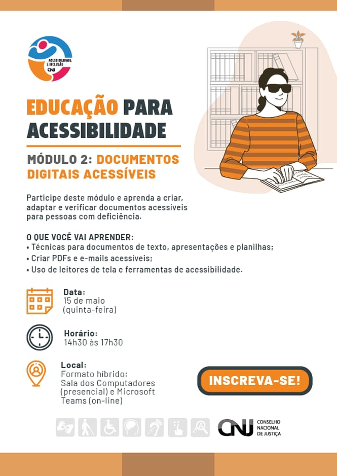 O Conselho Nacional de Justiça (CNJ), por meio do Setor de Acessibilidade e Apoio à Inclusão, oferece, nesta quinta-feira, 15, uma capacitação sobre “Documentos Acessíveis”. O curso será transmitido ao vivo, através do canal do CNJ no YouTube, das 14h30 às 17h30.