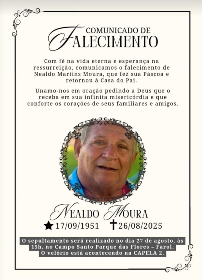 Com profundo pesar, informamos o falecimento do senhor Nealdo Moura, esposo da servidora Alcy Amorim, do setor de Biblioteca da Justiça Federal em Alagoas.