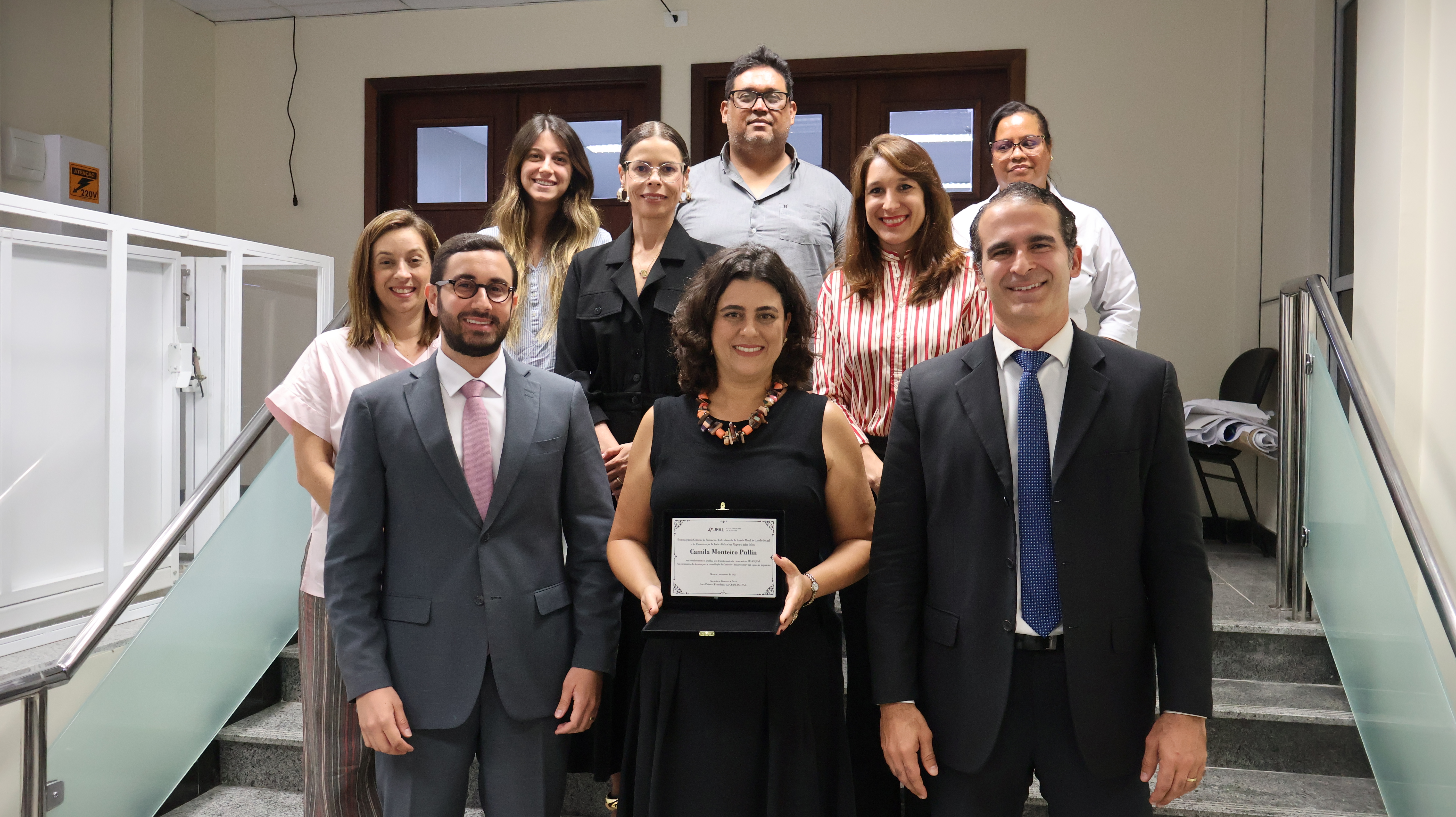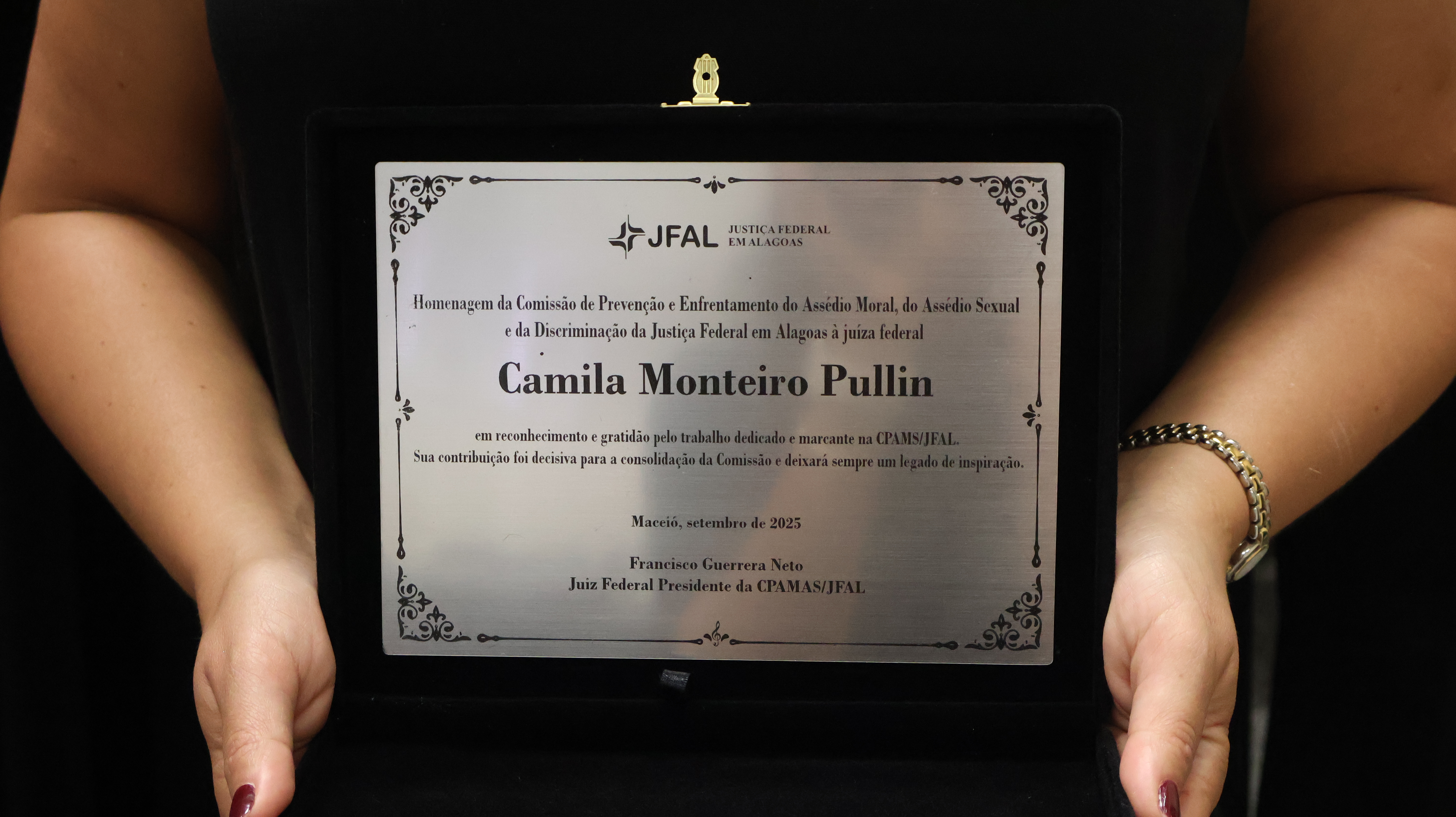 A juíza federal Camila Monteiro Pullin foi homenageada nesta quarta-feira, 29 de outubro, na sede da Justiça Federal em Alagoas (JFAL), em reconhecimento aos relevantes serviços prestados à Comissão de Prevenção e Enfrentamento do Assédio e da Discriminação (CPAMAS). A cerimônia marcou o encerramento de sua participação na Comissão, em razão de sua convocação para atuar como juíza auxiliar da Presidência do Conselho Nacional de Justiça (CNJ), na gestão 2025/2027 do ministro Edson Fachin.
