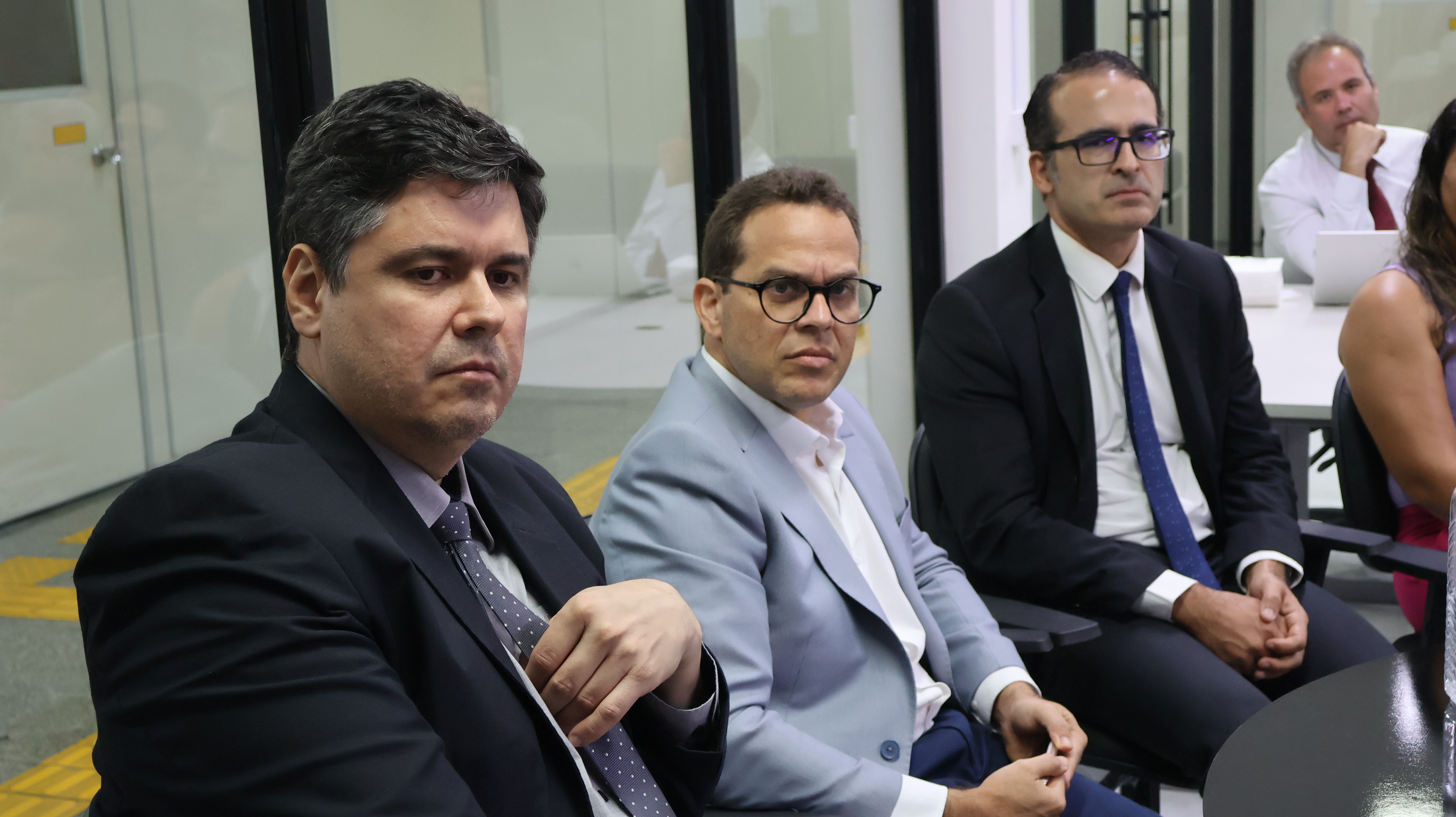 Juiz federal André Granja, secretário municipal do Gabinete Civil, Felipe Lins e juiz federal Antônio José acompanham apresentação feita pelo professor Márcio Ribeiro