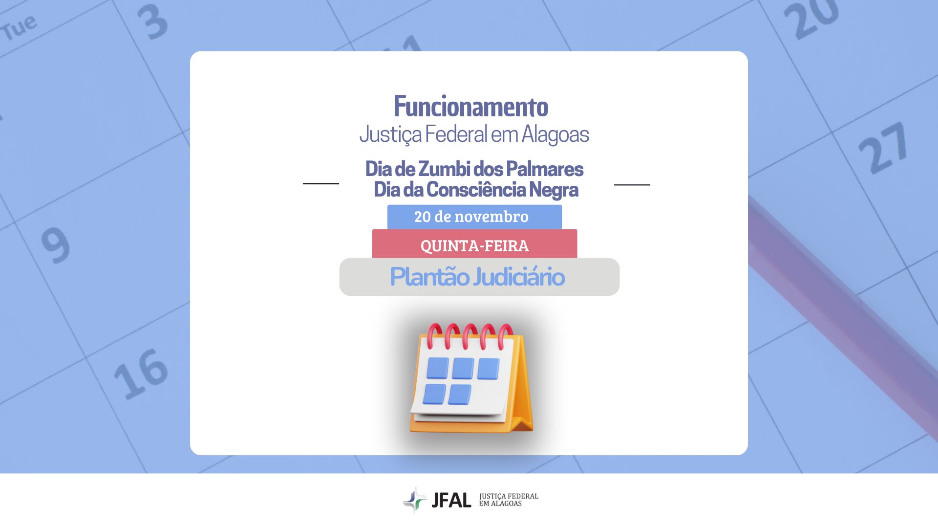 A Justiça Federal em Alagoas (JFAL) funciona em regime de plantão no próximo dia 20, quinta-feira. O motivo é a celebração do Dia Nacional de Zumbi e o da Consciência Negra. Nesta data, apenas o plantão judiciário estará funcionando, para atendimento exclusivo a casos urgentes. Os prazos processuais ficam suspensos e são transferidos para o próximo dia útil, ou seja, sexta-feira, 21.
