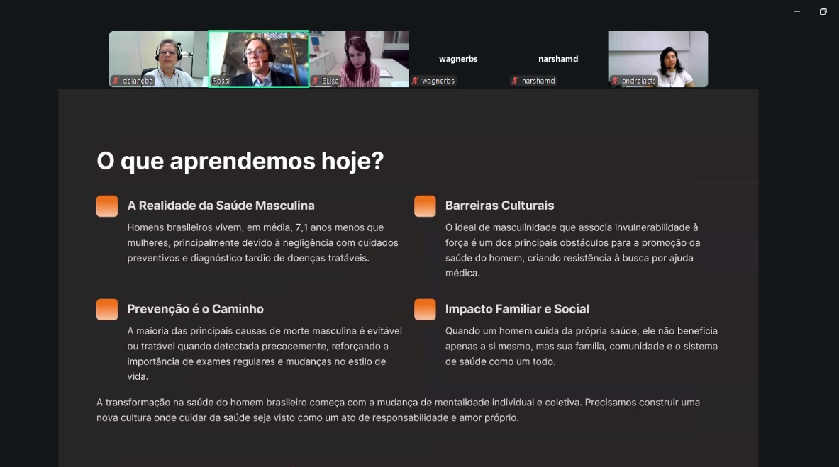 De acordo com o profissional baiano, um a cada seis homens brasileiros receberá o diagnóstico de câncer de próstata durante a vida. “E os homens da raça negra têm 3,5 vezes mais chances da doença, em comparação com o homem caucasiano”, acrescentou. Na conversa, o médico Roberto Rossi apresentou uma informação importante. “Não existe valor de PSA (Antígeno Prostático Específico) normal. Cada homem tem o seu, daí a importância do acompanhamento anual”, finalizou.