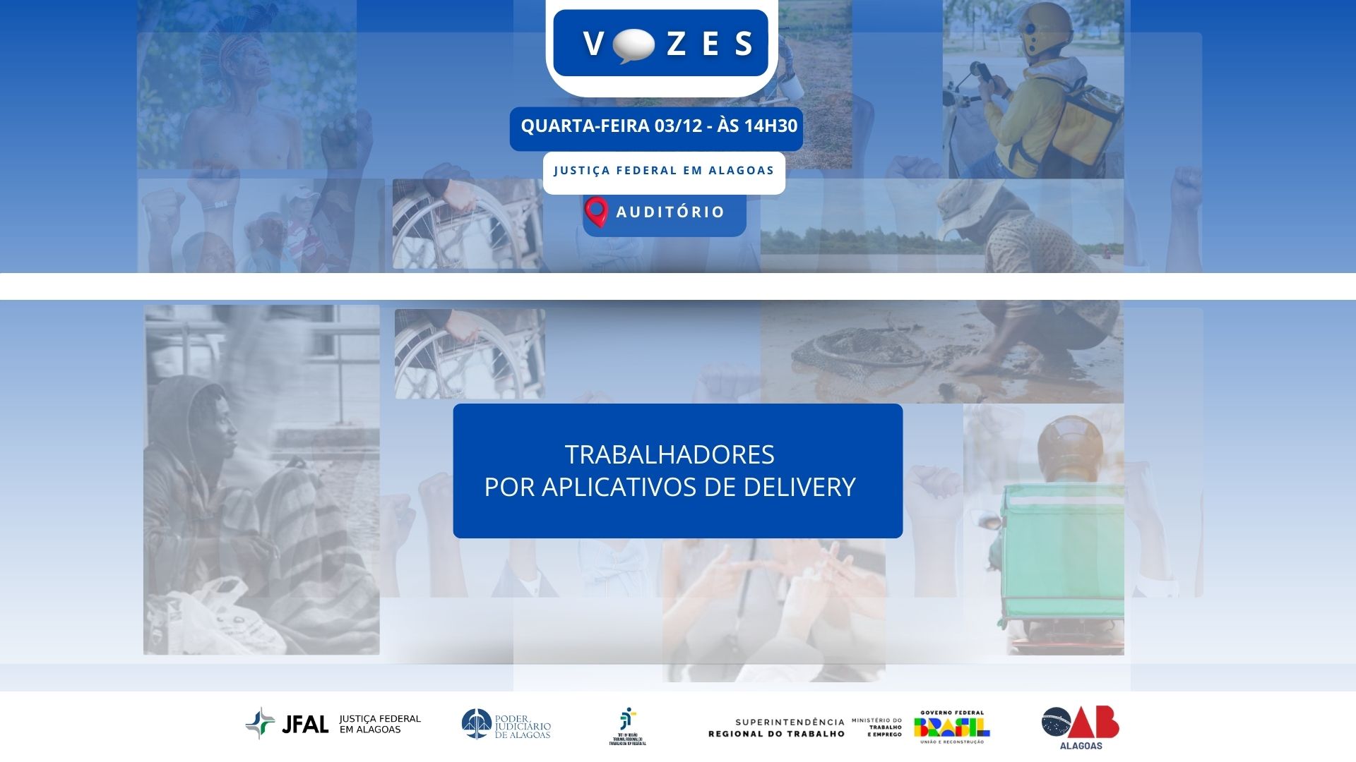 A Justiça Federal em Alagoas (JFAL), através do Projeto Vozes: Narrativas Sociais e Diálogos com o Sistema de Justiça, em parceria com o Tribunal de Justiça de Alagoas (TJAL), o Tribunal Regional do Trabalho de Alagoas (TRT/AL), o Ministério Público do Trabalho (MPT), a Superintendência Regional do Trabalho e Emprego de Alagoas e a OAB/AL, convida trabalhadores de entrega por aplicativo para participarem de Escuta Acolhedora, que será realizada no dia 3 de dezembro, das 14h30 às 17h30, na sede da JFAL.