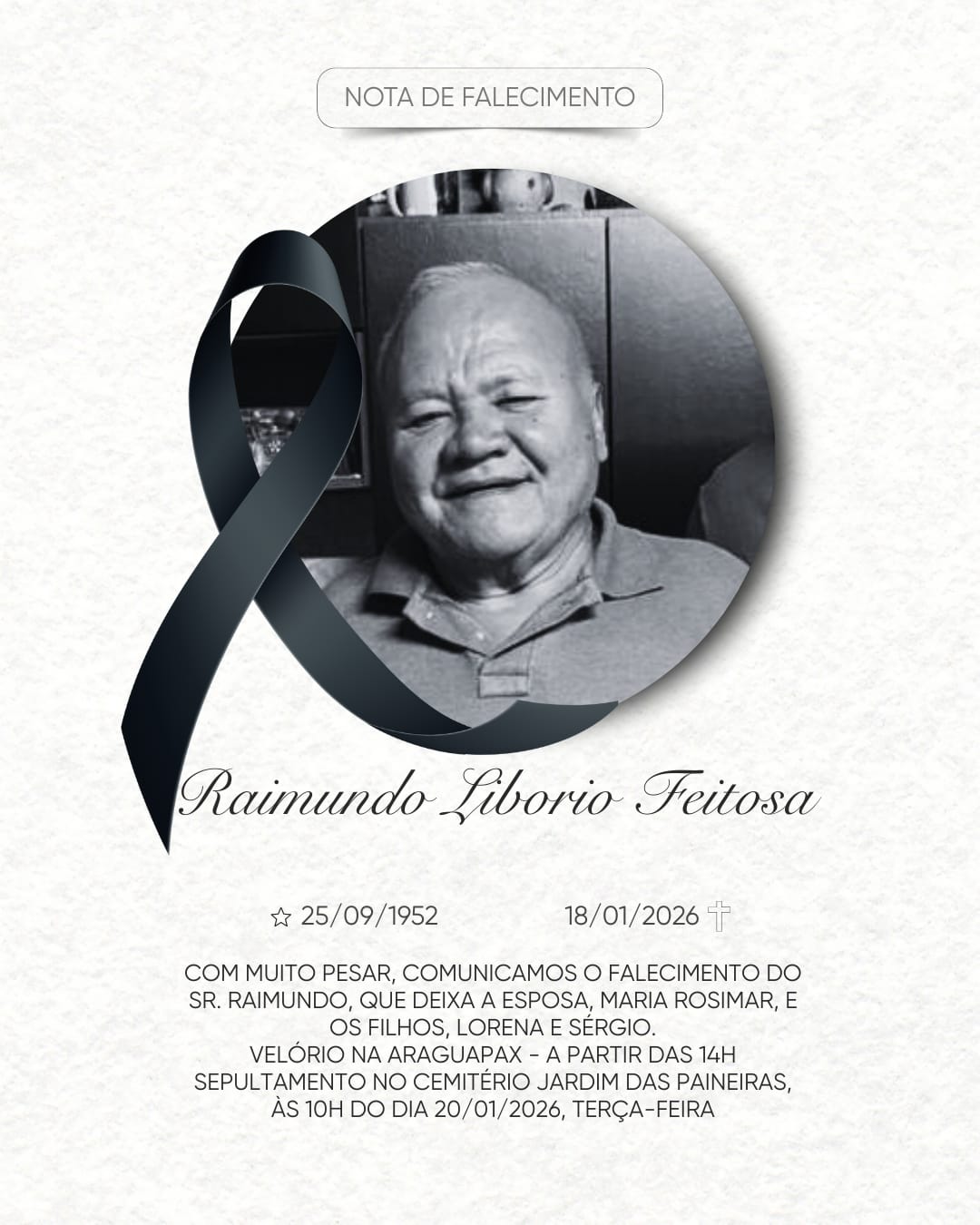 Com profundo pesar, informamos o falecimento do sr. Raimundo Libório Feitosa, ocorrido nesta madrugada. Ele é pai do juiz federal Sergio Silva Feitosa, da 6ª Vara Federal. O velório e o sepultamento ocorrem no município de Araguaína, estado do Tocantins.